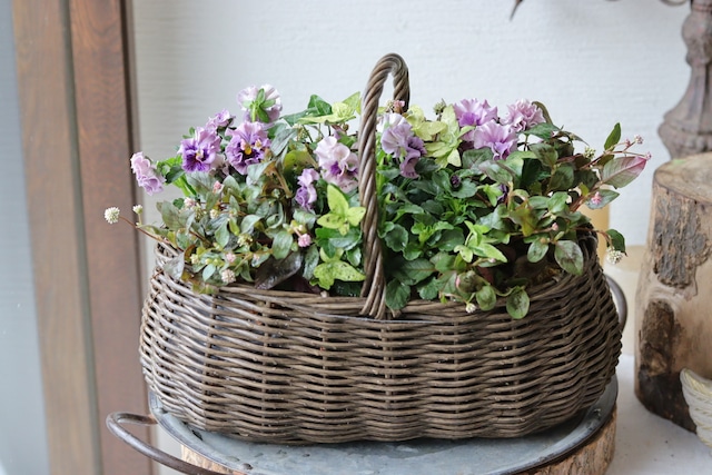 ふりふりミニパンジーの取手つき籠の寄せ植え