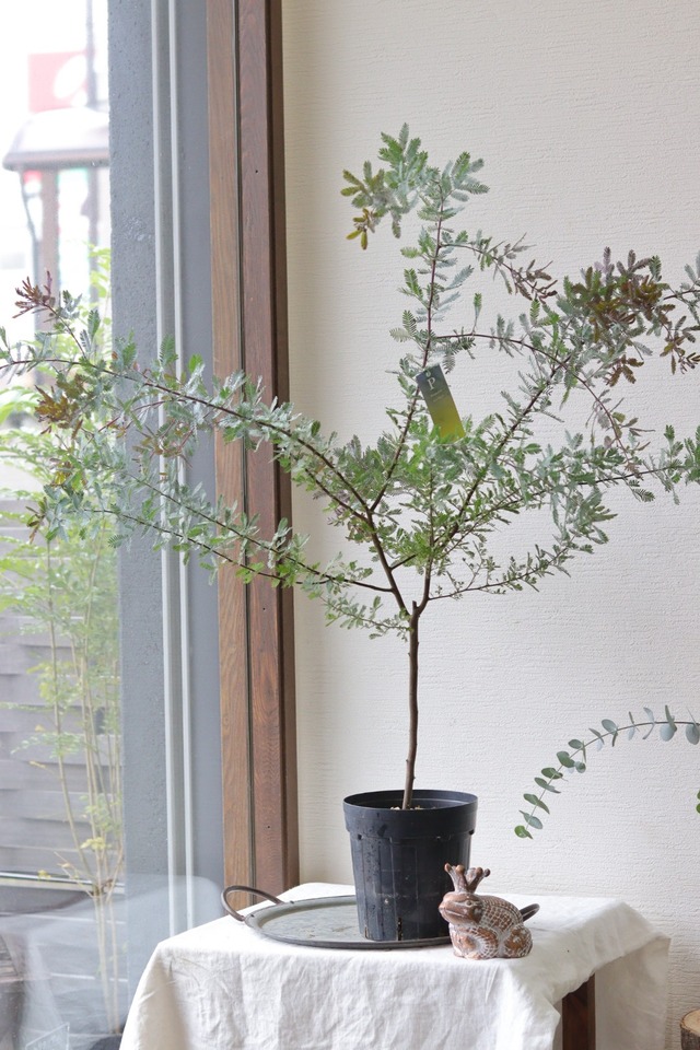 撮影日2025.10.28 ↑ 植物ですのでもちろん日々成長しております。 タイミングによっては写真と姿形が違う場合があります。 撮影日をご参考にしてください。 6寸 高さ約90cm 新芽が紫色に染まる品種で 銀色の葉とのコントラストを楽しめます。 花はもちろんですが、葉も美しく鑑賞価値があり 開花期以外の時期でも十分に楽しめます。 樹高は一般品種より低めに育ちます。 日当たり、水はけ、風通しがよい場所で育てます。 基本的に年中植え付けが可能ですが 適期は10-11月か3~5月です。 乾燥に強いので根付いてしまえば 特に水やりの必要はありません。 鉢植えは土の表面が乾いたらたっぷりと水やりをします。 寒さには弱いので冬は控えめにします。 基本的に追肥は必要ありませんが 鉢植えの場合や葉色が薄くなってきた場合は 花後の4月~5月に粒状の化成肥料を施します。 ミモザは8月頃には翌年のつぼみが 目で確認できるようになり開花まで半年近くかかります。 そのため花後から7月上旬頃までに剪定を終わらせます。 強風で枝が折れやすいため、伸びすぎた枝や、混み合った枝を根元から剪定します。 夏以降に剪定すると、翌年の花が咲かなくなるので注意します。