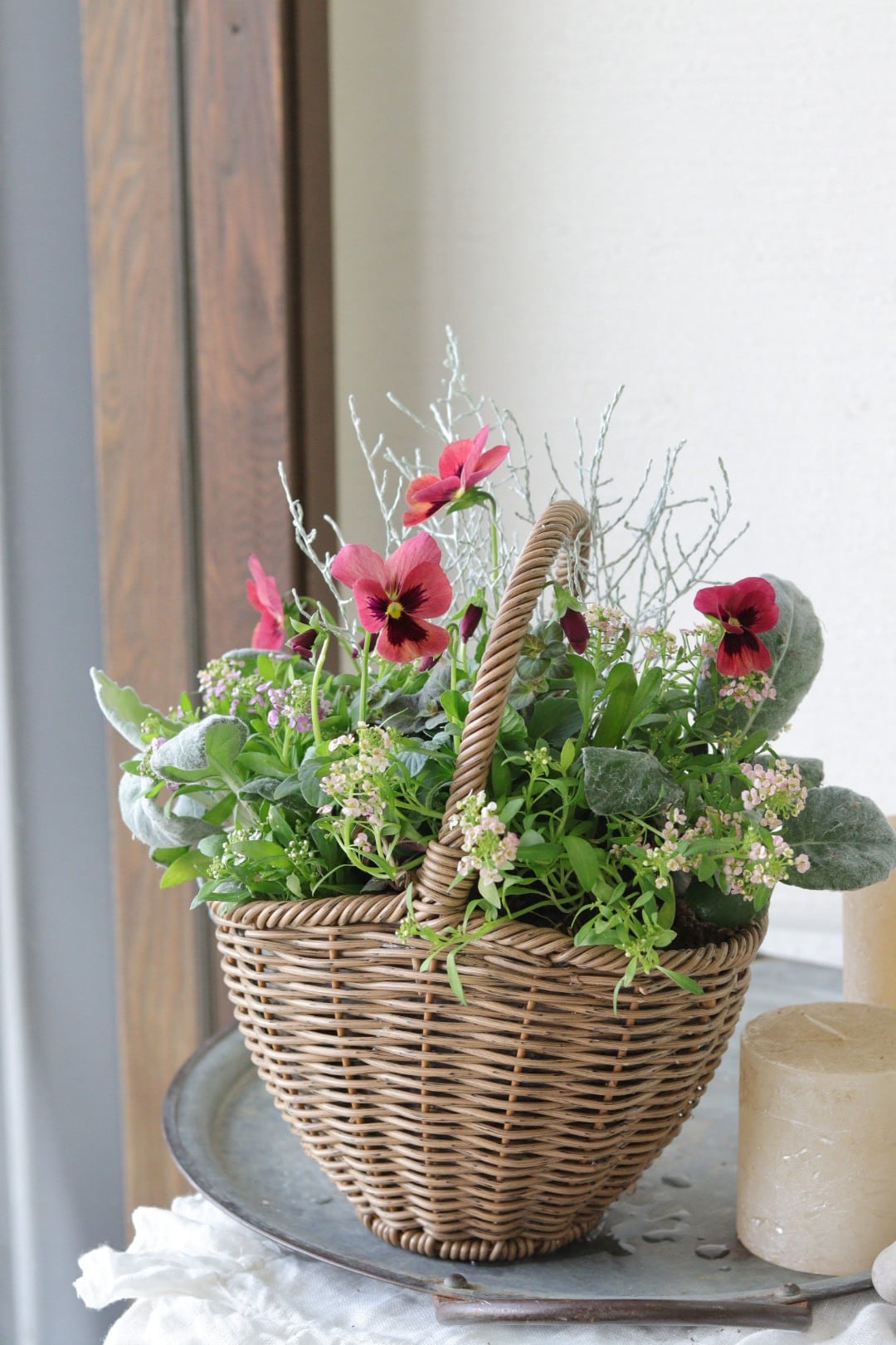 華やかパンジーわらくの籠寄せ植え