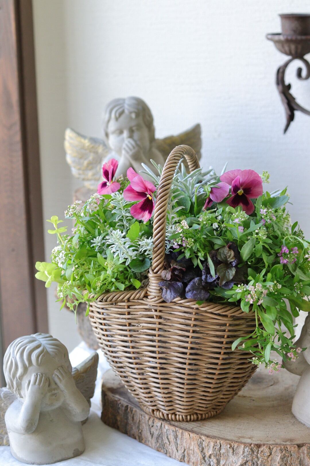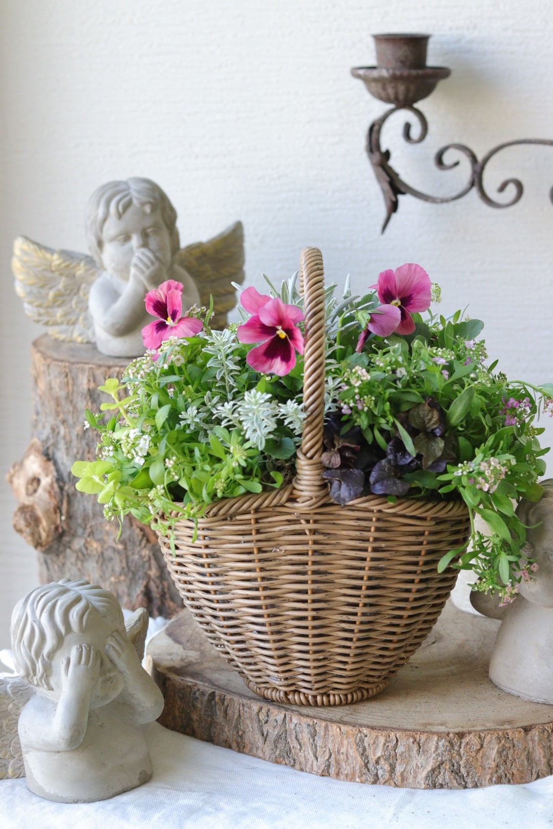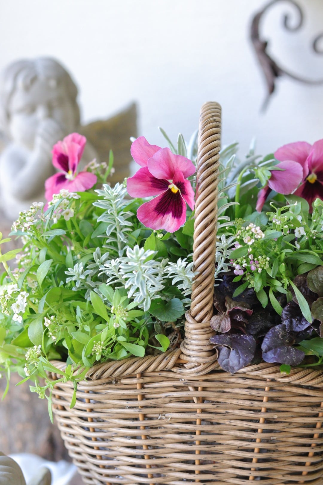 パンジーわらくとダークリーフの籠寄せ植え
