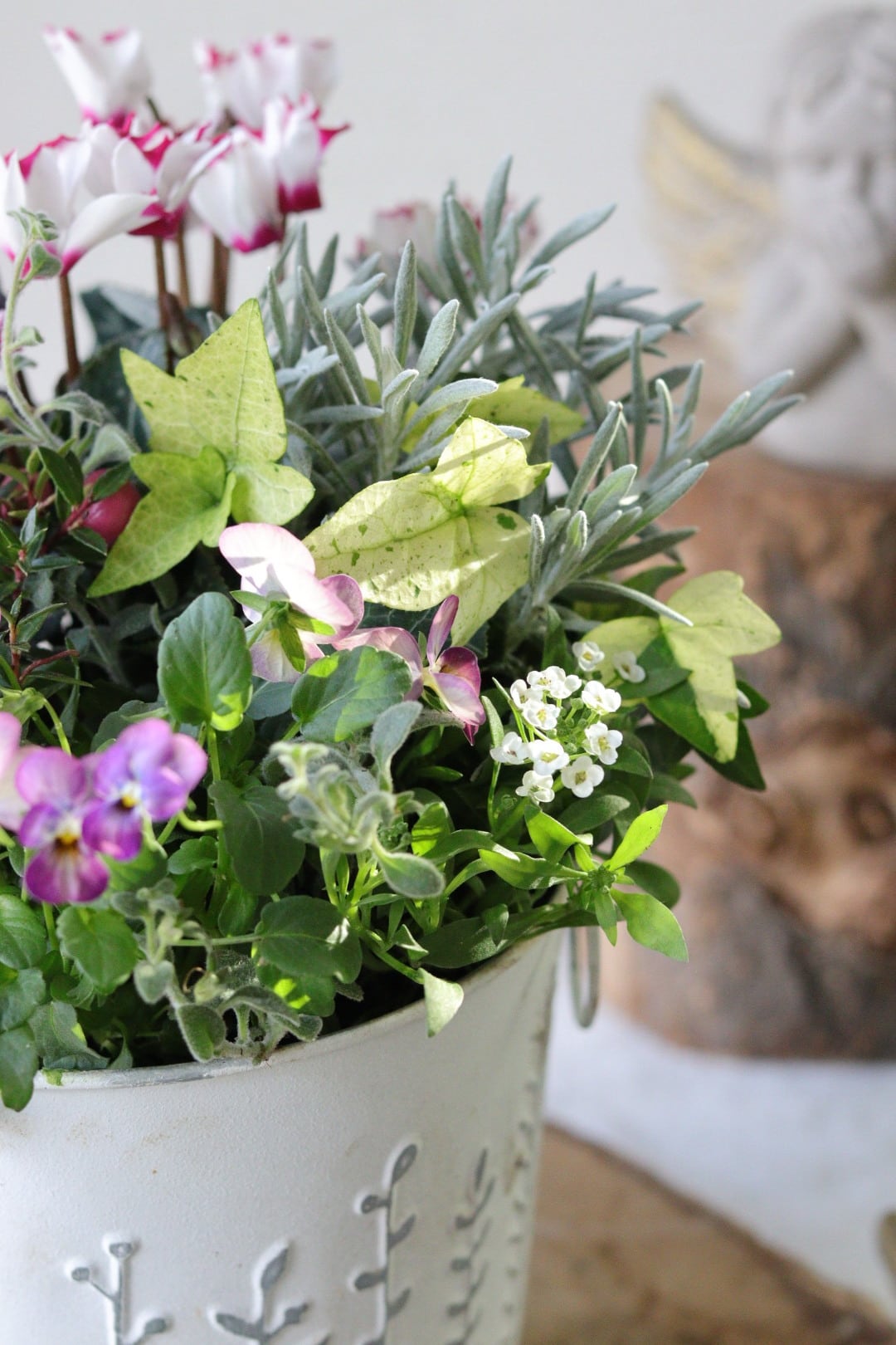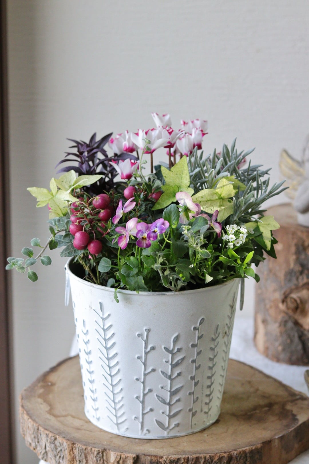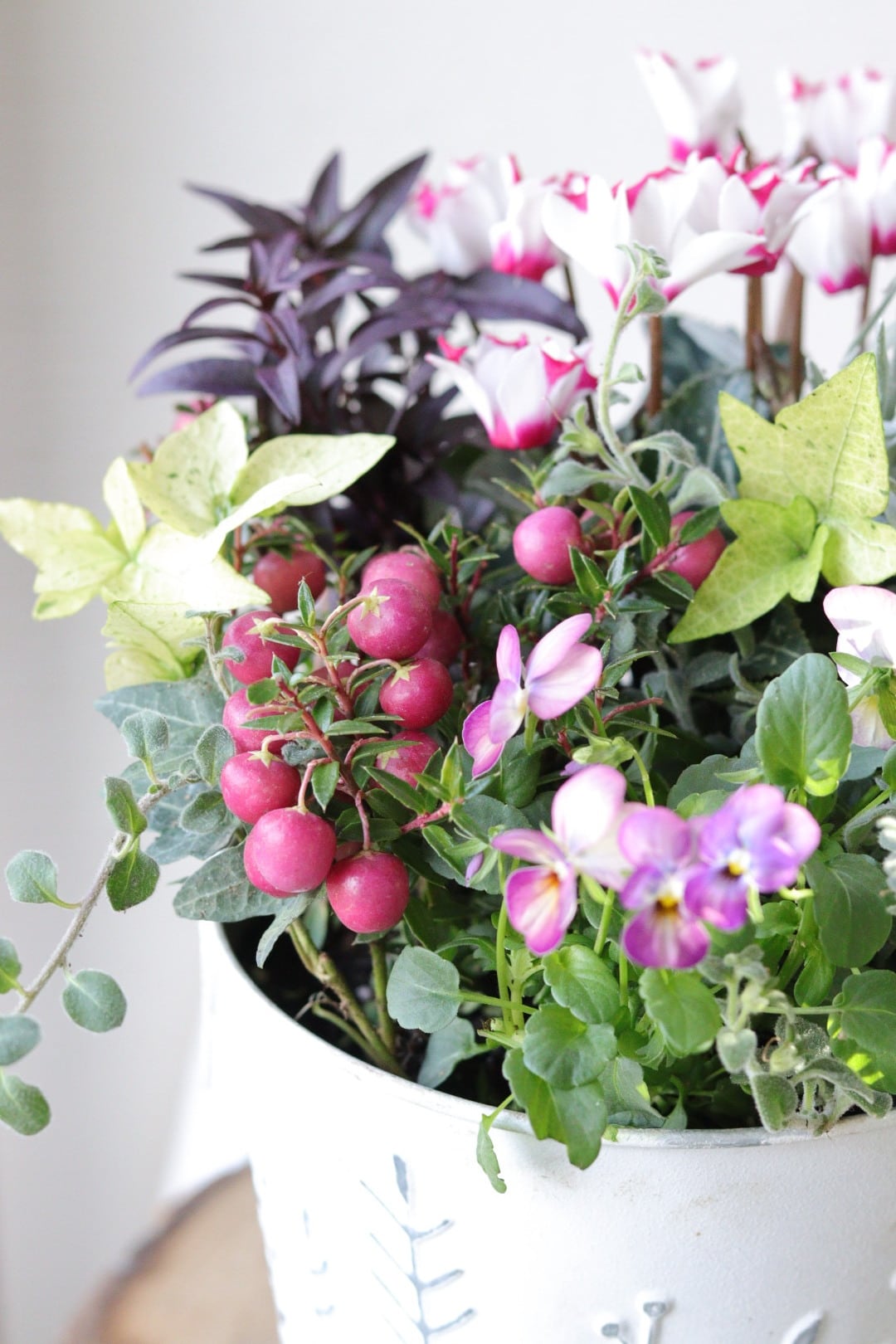 シクラメンとビオラの冬のブリキ寄せ植え