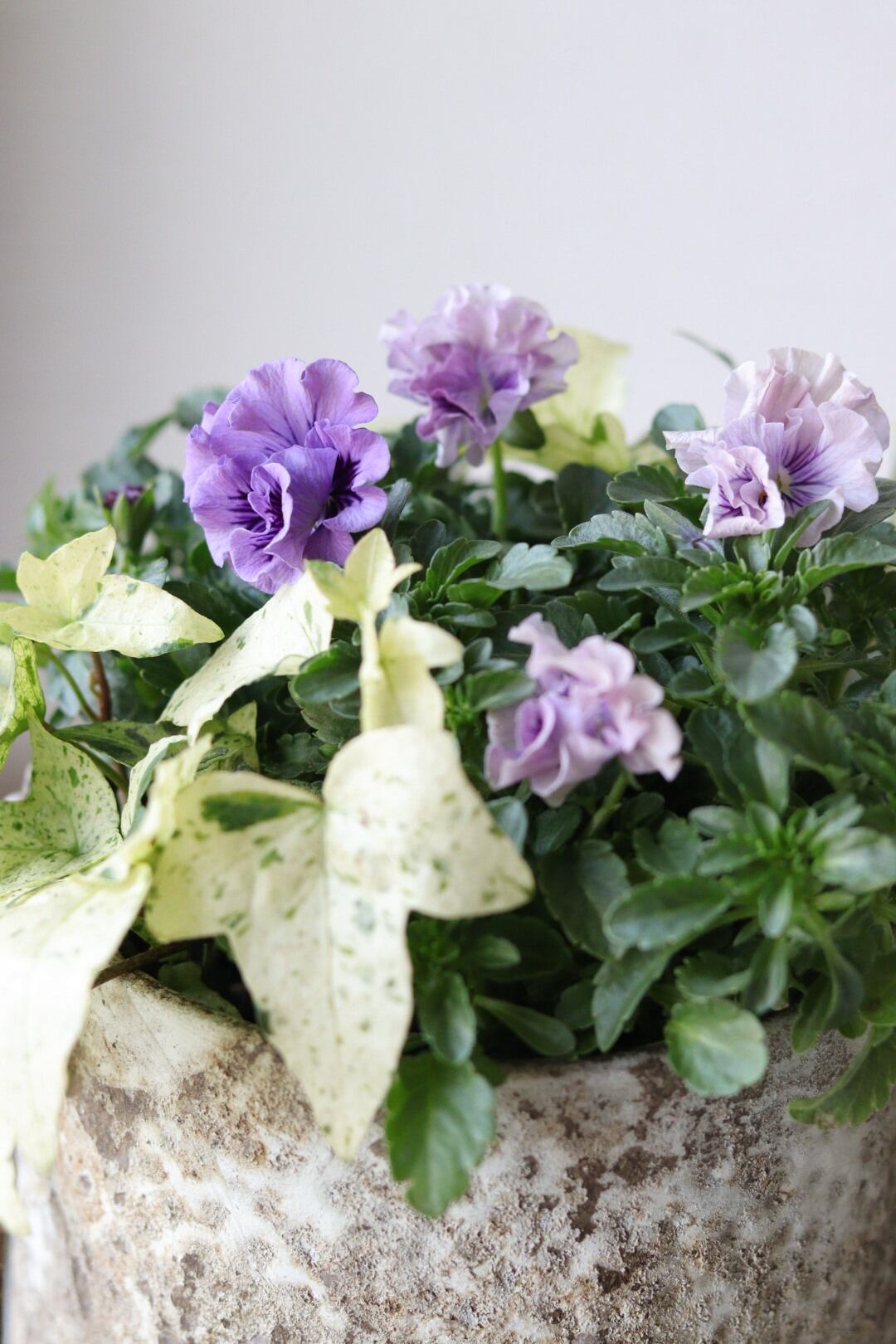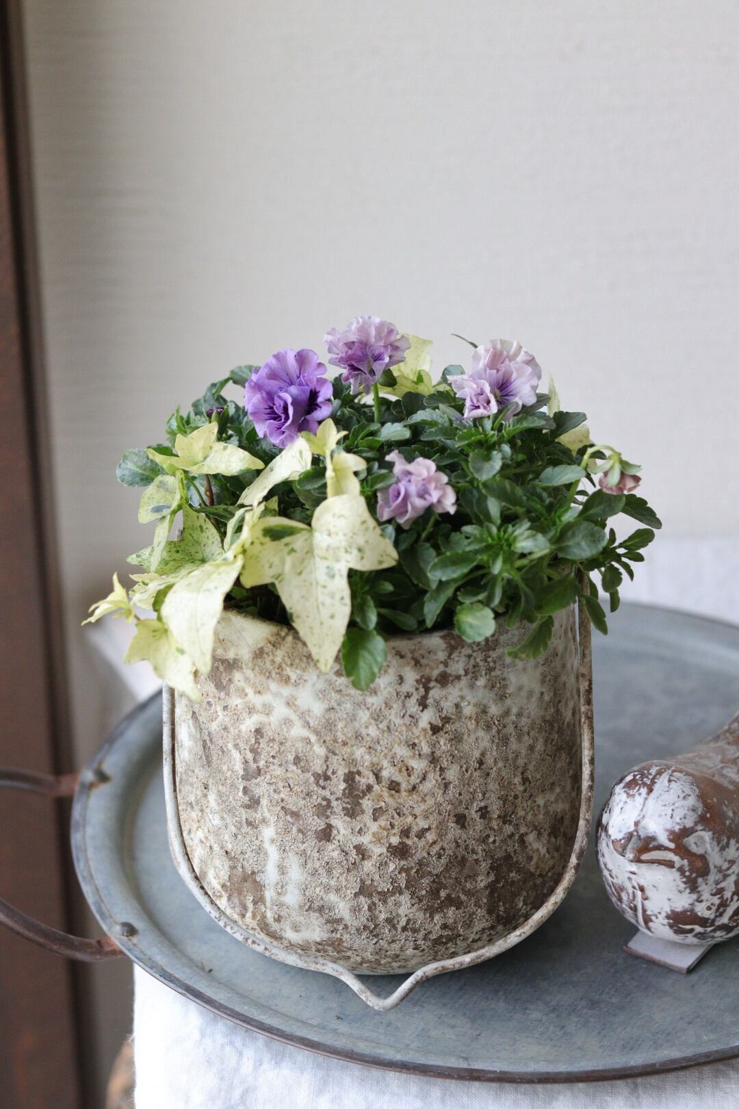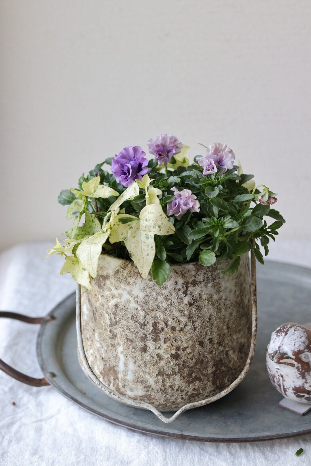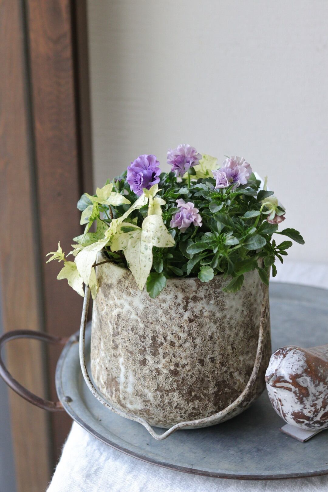 フリルパンジーとヘデラのアンティークな寄せ植え