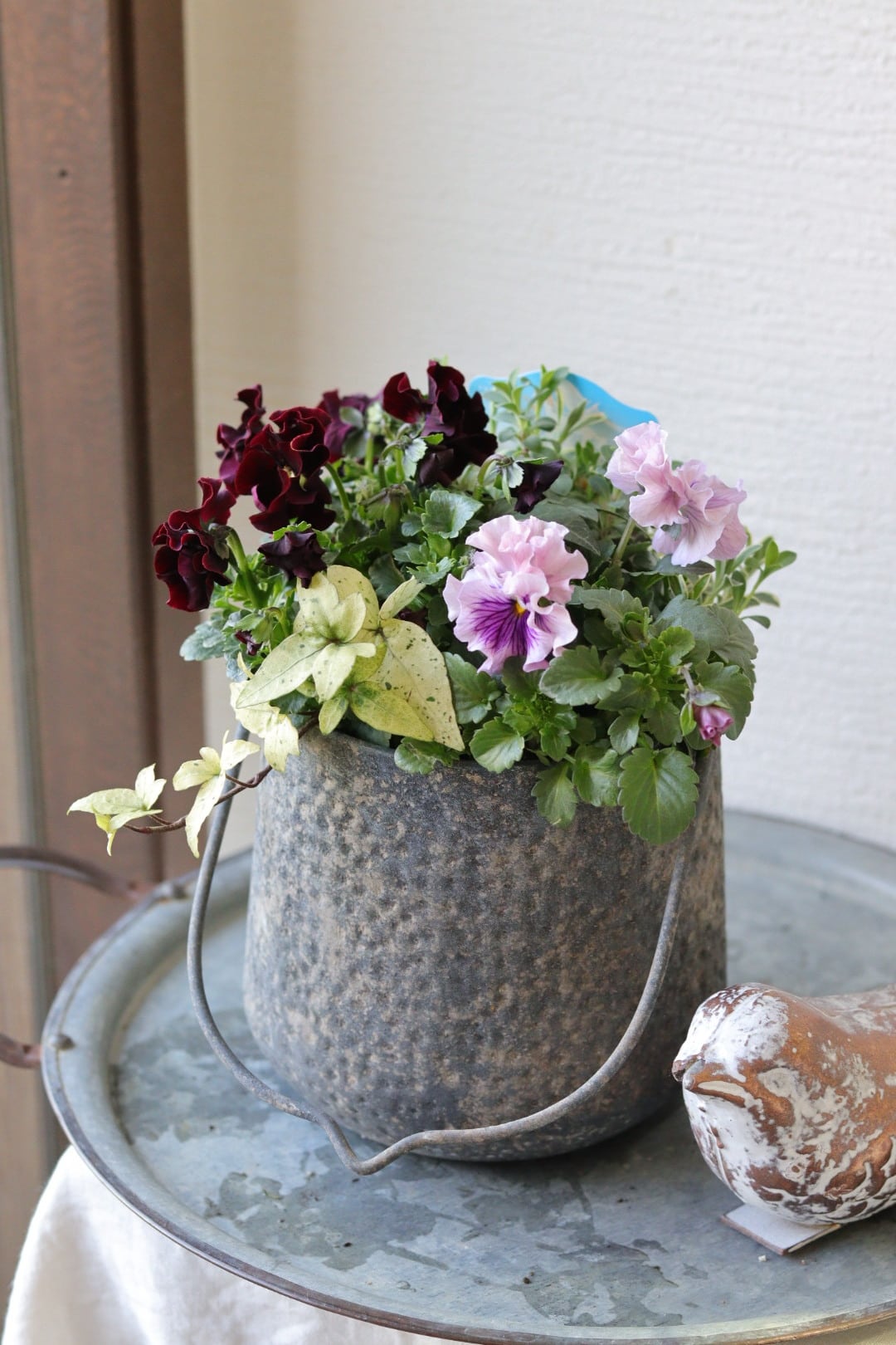 フリルパンジーとヘデラのシックな寄せ植え
