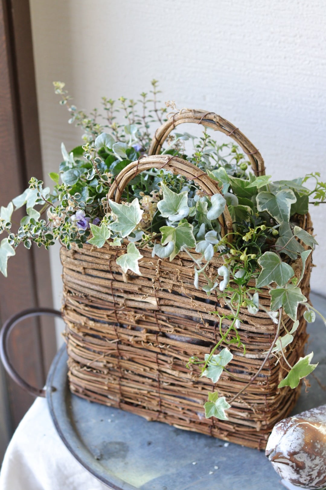 クレマチスペトリエイとリーフの籠バック寄せ植え