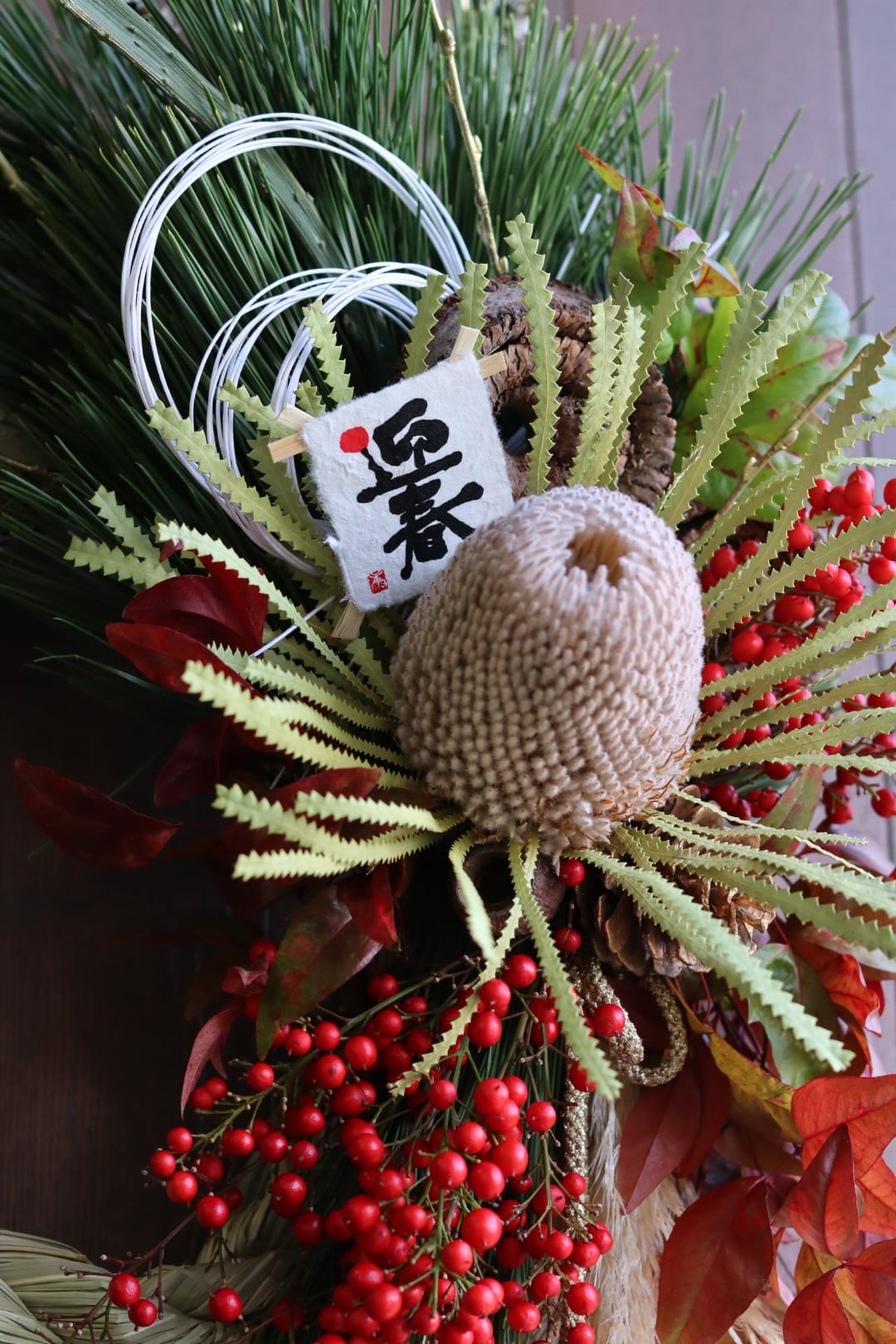 こっくり落ち着いたカラーの和モダンしめ縄飾り。
